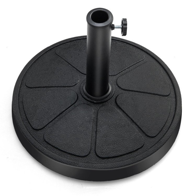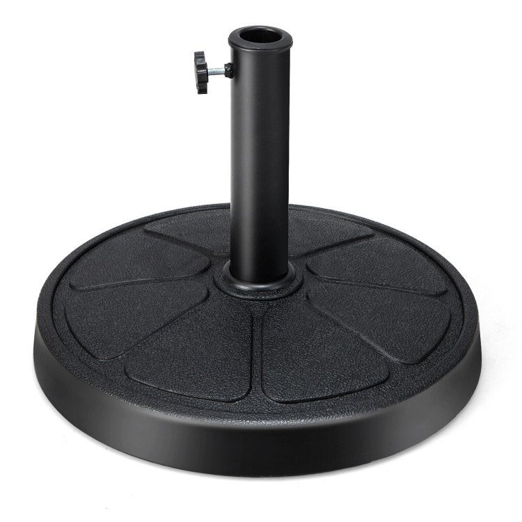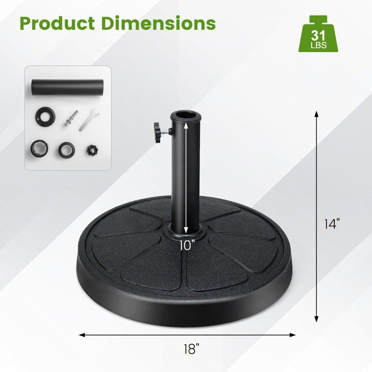 3.Security and Stability: The heavy-duty round umbrella stand measures 18" x 14" (Dia. x H) and weighs 31 lbs, which is large and heavy enough to withstand wind. More than that, there exists an adjustable fixed knob for stabilizing the pole, preventing wobbling.